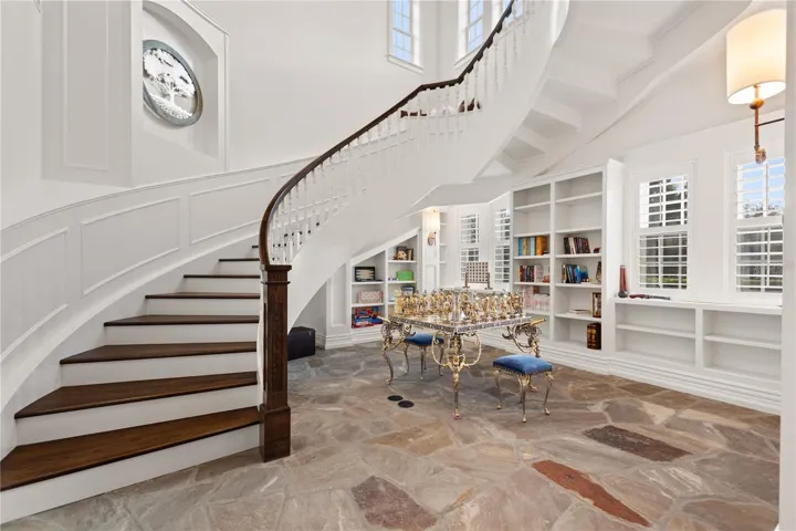 Once inside, you’ll be warmly welcomed by a 2 story entrance gallery flanked by (4) 13’ double arched custom mirrored niches. Left to the 2 story, wood paneled study & fireplace w/separate entry, a British inspired sports pub/trophy room, a powder room w/hand laid marble mosaic tiles.