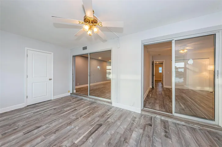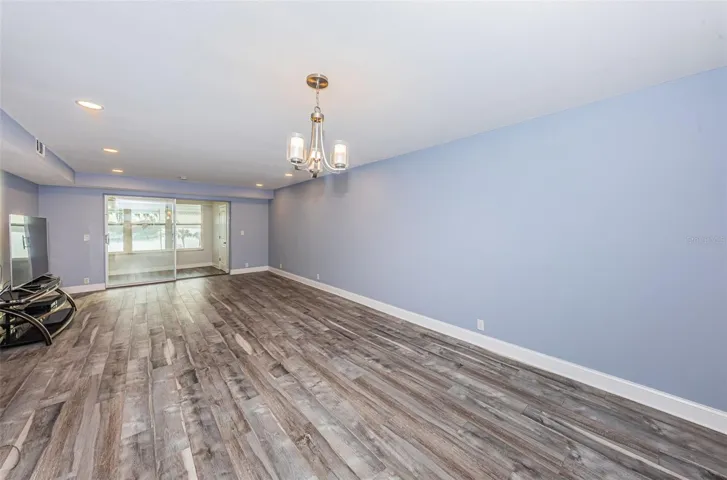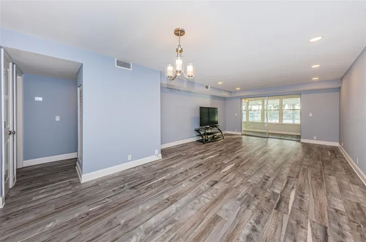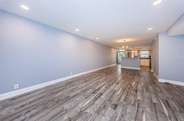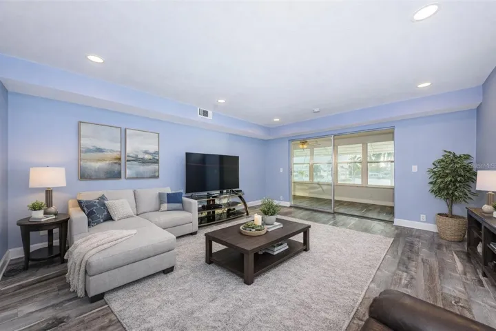 The open living and dining areas showcase new wood-look plank flooring and flow seamlessly into the oversized Florida Room/Den/Office, where wall-to-wall windows capture million-dollar water views and unforgettable sunrises and sunsets.