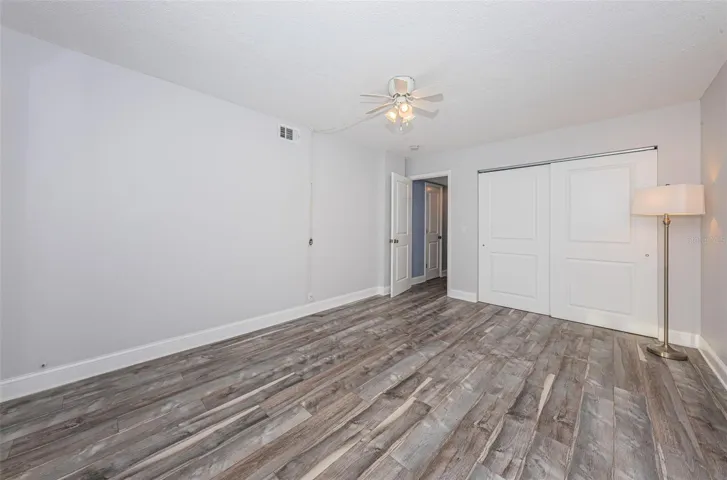 The spacious Master Suite, accessible from the Florida Room or hallway, offers serene water views, a wall-to-wall closet, and a private ensuite bath with glass-enclosed shower, updated vanity, and designer lighting. A split-bedroom floor plan provides privacy for guests, with a generously sized guest bedroom featuring a large closet and water views. The main bath includes a tub/shower combo and updated finishes.