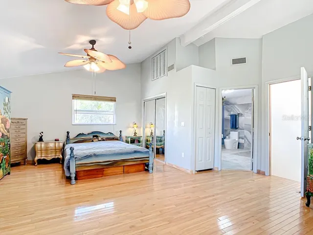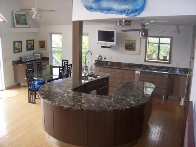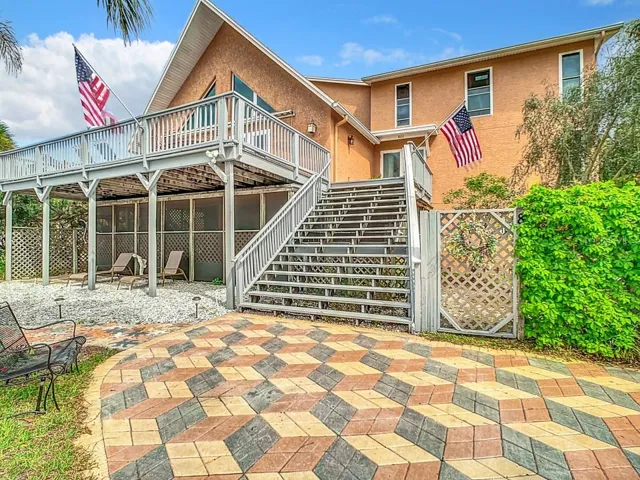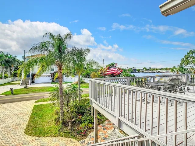 Live the Florida dream in this golf cart family community, 4/4 stucco home. This home faces out onto the Sutherland Bayou and public boat ramp. The breeze is amazing. Watch birds, dolphins and boats drifting by from the comfort of your living room couch or out 1 of French doors that open to the 464 sq.ft.2nd floor deck with a retractable awning. This well maintained unique contemporary A Frame custom built home was completely renovated and doubled in its living space in 2003 offering tons of storage space. No detail was missed. The dramatic wide stairway takes you up to the main level where you will find real wood Beech flooring, ceiling fans and vaulted ceilings throughout. An enormous Family Room with a double sink wet bar ready to receive guests. On the other side there is a Living, Dining Room and Designer Modern Kitchen that was custom built in 2014 with all the features that a chef desires. Solid wood hand built deep cabinets & drawers, pull out shelves, induction stove top, double oven, microwave drawer & granite countertops are just some of the amenities you will find. Also on the main floor you will find a bedroom with a Murphy bed and a full bathroom with double showers and marble floors & walls. Split stairways to the upper floor lead to 3 additional bedrooms. On the north the oversized Master Suite features 2 California closets and a view of the bayou. The Master Bath was renovated in Nov. 2022. It offers oversized Porcelain wall & floor tiles, modern double showers with a bench, double sink vanity, quartz countertops and high end European cabinets. On the south wing you will find the 2 other large suites, 3rd bathroom. On the ground floor you will find an unconventional 540 sq. ft, air conditioned mother in law suite/apt. with a Queen Murphy bed, porcelain tile floors, kitchen and bathroom. It can be accessed 3 ways: a spiral staircase off the family room, a door from the garage and the French doors that open into the 600 sq ft. no-see-um screened porch with terracotta tile flooring & ceiling fans. The fenced in backyard features a greenhouse with a drain and pump to improve yard drainage during severe storms along with an outdoor shower. The home has a 2 plus car garage. In addition, the 2 driveways can accommodate between 9 to 12 cars so you can park your boat or motorhome! This house is in a highly sought prime location and sits on a corner lot. You are 1 block away from ballfields, a hockey roller rink, a volleyball court and a few blocks to a small beach, playground, fishing pier, public boat launch, restaurants, breweries and shops. Less than 2 blocks away from the 45 mile long Pinellas Trail, which provides hiking or biking from Tarpon Springs to St. Petersburg. You are a few blocks from highly rated Palm Harbor University High School and within a short biking or driving distance to Tarpon Springs, Dunedin, Clearwater Beach. Tampa International Airport is a convenient 30 minute drive, Also there is no HOA !! Don’t let this opportunity pass you by. This property won’t last long!