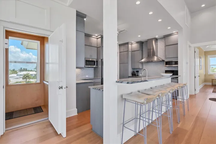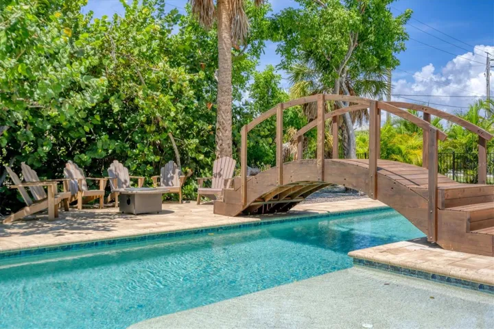 Indulge in the expansive 67-foot heated lap pool, adorned with a custom-designed bridge that adds a touch of elegance and playful charm. As the sun sets, gather around the fire pit or savor the breathtaking million-dollar views of the sun setting over the Gulf from the rooftop terrace. This elevated perspective, the highest point that the eye can see, reveals a panoramic landscape that defies mere photographs. Multiple balconies and expansive decks offer the perfect vantage points to enjoy the beach views peeking through the palms. Take advantage of the cool evening breeze while grilling your fresh fish on the propane grill. The home is designed with an elevator for easy access to all floors, making it suitable for guests of all ages.