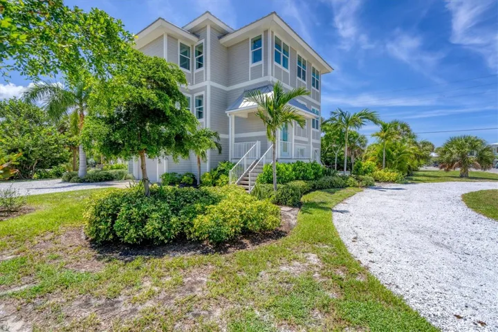 Welcome to The Gasparilla Lookout, an exquisite 5-bedroom, 4.5-bathroom home boasting an innovative upside-down design, with the primary living areas, including the Master Suite, gourmet kitchen, dining space and luxurious living room, perched on the top level. This elevated vantage point offers unrivaled, panoramic views of the Gulf, framed by the lush palms.