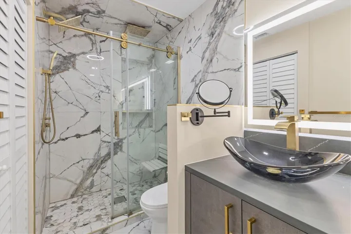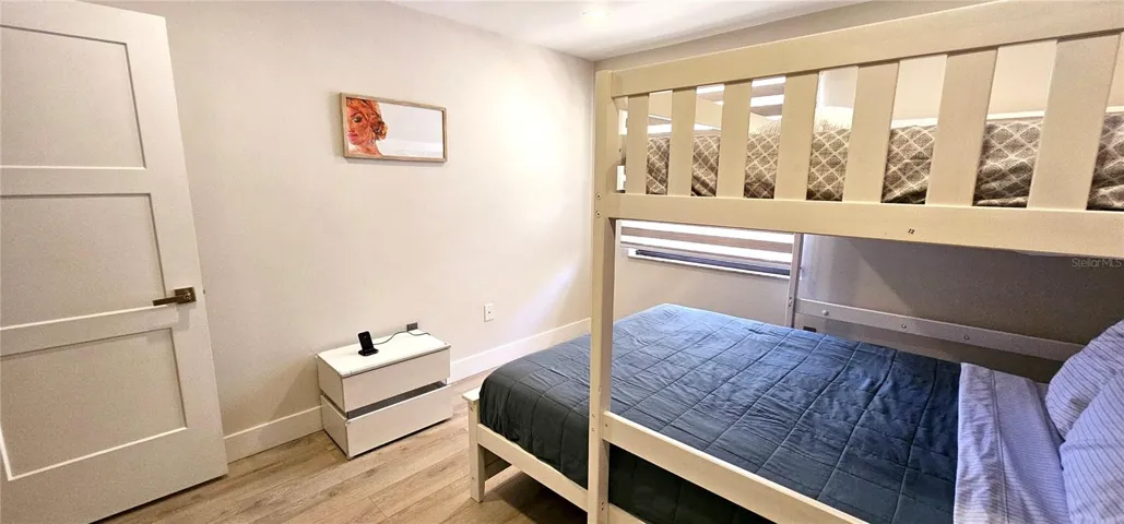 Both bathrooms are fully remodeled to match the condo’s distinct design, each featuring spa-like rainfall shower systems with handheld wands. The guest bathroom also includes a bidet. The master bedroom features a sturdy king-size bed, while the guest bedroom has a full-over-queen bunk bed. The in-unit laundry includes a smart and quiet washer and dryer. In addition, the community offers a refreshing 8.5-foot-deep pool.