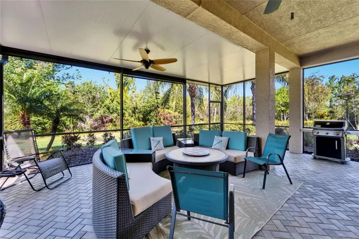 MARKET ADJUSTMENT ! Easy to show, come take a look ! Spectacular FULLY FURNISHED GENOVA model with both WATER and CONSERVATION views. This 2074 Sq. Ft. home features 2 bedrooms plus den / study, 2 baths and 2 car garage. Move in ready, everything included, just bring your toothbrush! Extended covered lanai with propane gas fire pit to enjoy the scenic water and conservation views. GOLF CART INCLUDED with newer lithium batteries. ACCORDIAN HURRICANE SHUTTERS on windows along with whole house gutters. Open floor plan is perfect for daily living and entertaining. Wide sliders lead out to the extended screened lanai with covered roof. Outdoor furniture and Weber grill included so you can relax and enjoy the sun with both water and conservation views. Gourmet kitchen features breakfast bar, 42 inch wood cabinets, over/under lighting, granite counters, tile backsplash and