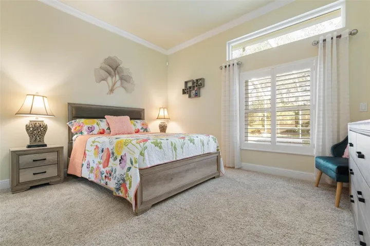 The main residence, with 2,616 sq ft of living space, features a thoughtfully designed split-bedroom floor plan. The sprawling primary suite includes a sitting area, perfect for use as an office or nursery, with serene views of the pool. Meticulously designed dual walk-in closets and vanities, a luxurious soaking tub, and a separate shower complete this tranquil space. On the opposite side of the home, two additional bedrooms and a dedicated office space with a convenient pool bath provide privacy and functionality.