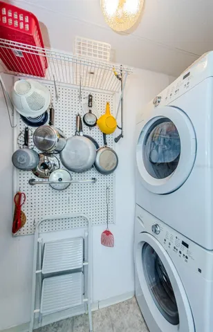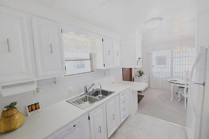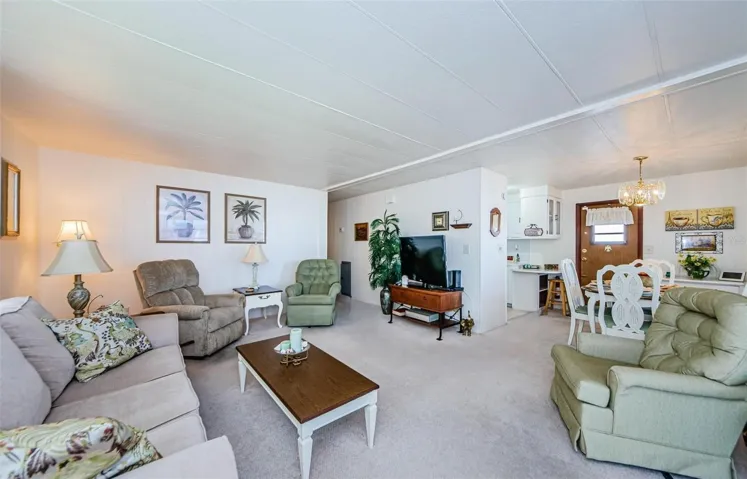 The bright, open layout includes a welcoming front porch and a spacious Florida Room with abundant windows and a portable A/C for year-round comfort. The updated kitchen and baths are fully equipped, with all appliances included, plus a newer full-size stackable washer and dryer conveniently located in the kitchen pantry/laundry closet. The primary suite features a walk-in closet and en-suite bath with step-in shower, while the guest bedroom offers an en-suite feel with direct access to the hall bath, which includes dual sinks, a step-in shower, and grab bars. Ceiling fans in the primary bedroom, guest bedroom, and Florida Room enhance comfort throughout the home. A 2-car carport and extended driveway easily provides parking for 2 vehicles and a golf cart.
