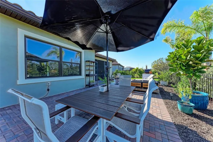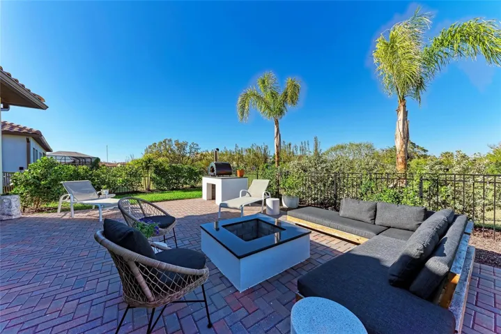 Outdoor living truly shines here—enjoy a screened front entry and lanai, a designer summer kitchen with gas grill, side burner, wine fridge, ice maker, wood-burning fire pit, and pizza oven stand. The fully fenced backyard is surrounded by lush landscaping and offers peekaboo views of the Manatee River.