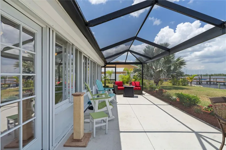 WATERFRONT HOME IN HARBOUR HEIGHTS ALONG THE PEACE RIVER W/ **NEW ROOF**, **104 FT OF WATER FRONTAGE** & EXCEPTIONAL WATER VIEWS OF WHIDDEN BAY AND ASSUMABLE 2.75% VA MORTGAGE & NO 2026 PROPERTY TAXES. WOW! – This beautifully updated 3 bed/2 bath home has been updated throughout, creating a light and bright waterfront retreat with a contemporary open floor plan and coastal charm. The spacious layout includes an open-concept living room, kitchen, and Florida room. The kitchen features stainless steel appliances, a mix of quartz and butcher block countertops, a breakfast bar, designer pendant lighting, and solid wood cabinetry. Large picture windows in the Florida room and master bedroom showcase breathtaking water views. Additional architectural details are tile flooring throughout including beautiful Mexican tile in the Florida room, a shiplap accent wall, and modern ceiling fans. The spacious master suite boasts an oversized walk-in closet and a spa-like master bath with an LED lighted mirror and a glass-enclosed shower. The split-bedroom floor plan offers two large guest rooms. A French door leads to the screened patio, where picture frame screens provide a pest-free, unobstructed view. Enjoy stunning sunrises over Whidden Bay. LONG LIST OF UPDATES, including a NEW roof, ALL NEW stainless-steel appliances, NEW water heater, NEW electrical wiring with a new electrical box and wiring from the street to the home, NEW PEX plumbing throughout, NEW impact garage door, and NEW shed. Additional features include whole-house hurricane protection with electric and manual roll-down shutters, an oversized attached two-car garage with a workshop, and an adjacent shed. Lush tropical landscaping surrounds the home, creating a private oasis. A small sandy beach has been added between the davits, while a wooden dock is ready to accommodate your boat, kayak, wave runner, or paddleboard. Plenty of room in the back to build a pool and have the backyard of your dreams. Begin your maritime adventures right from your backyard and experience the Florida dream. This home offers front-row access to some of the best fishing and boating in Southwest Florida. Home is located on a VERY QUIET street. Harbour Heights features a nearby waterfront park with a playground, boat launch, tennis and pickleball courts, basketball courts, and a picnic area.