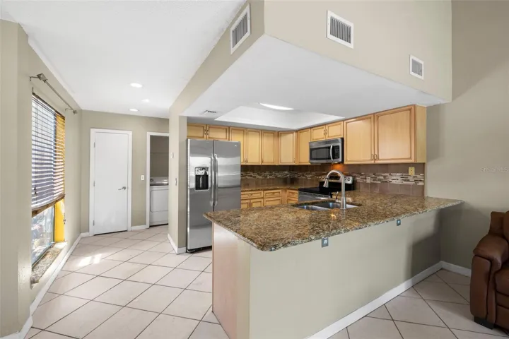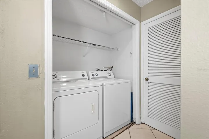 Both bedrooms are generously sized and include built-in closets. Additional features include an interior laundry room with a washer and dryer, as well as tile flooring in the common areas for easy maintenance.