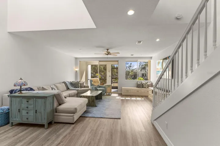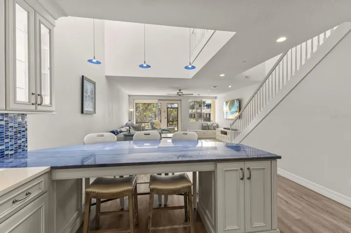 REDUCED PRICE! Are you looking for a RESORT home with spacious rooms, fine finishes, vaulted ceilings and the convenience of a condo community with bay and beach access? Look no further. Luxury and style await in this beautifully updated townhouse, located behind the gates of the exclusive Bay Isles resort. With 1,590 sq. ft. of meticulously designed and finished indoor living space plus another 1,100 sq. ft. of screened lanai, storage and garage space, this resort home provides the ultimate in luxe living, comfort and convenience. Upon entering this home, you’re greeted by an open concept great room and designer kitchen, vaulted ceilings, a conveniently placed guest bathroom, and views over the very private community pool. You’ll never want to leave! The gourmet kitchen is a chef’s dream, featuring gleaming granite countertops including a striking azure blue granite breakfast bar, custom mosaic glass tile backsplash, solid wood cabinetry, and stainless JennAir appliances. Easy to maintain luxury vinyl plank floors flow throughout, adding sophistication and durability. Soaring cathedral ceilings and abundant natural light enhance the light, bright, spacious feel of this home and the private screened lanai offers a serene retreat with access to lushly landscaped grounds and the resort style pool. The oversized primary suite boasts vaulted ceilings, a walk-in closet, and an elegant ensuite bath with natural stone and custom tile shower. The second bedroom also has a vaulted ceiling plus walk-in closet and beautifully finished adjacent bathroom. The ground-level garage has extra depth enabling covered parking for two cars plus there’s a separate room that can be flexibly used for storage, a home gym, or a wine cellar. As a Bay Isles resident, you’ll enjoy exclusive access to resident-only amenities including a private clubhouse, fitness center, heated pool and spa, tennis courts, and the private Bay Isles Beach Club. This resort home is just minutes from the vibrant dining, shopping, and cultural scene of St. Armands Circle and downtown Sarasota. See this home today and enjoy the best of Longboat Key living.
