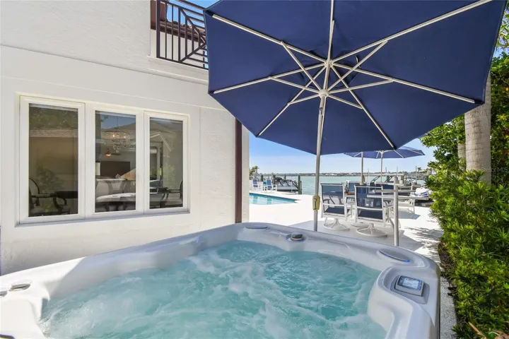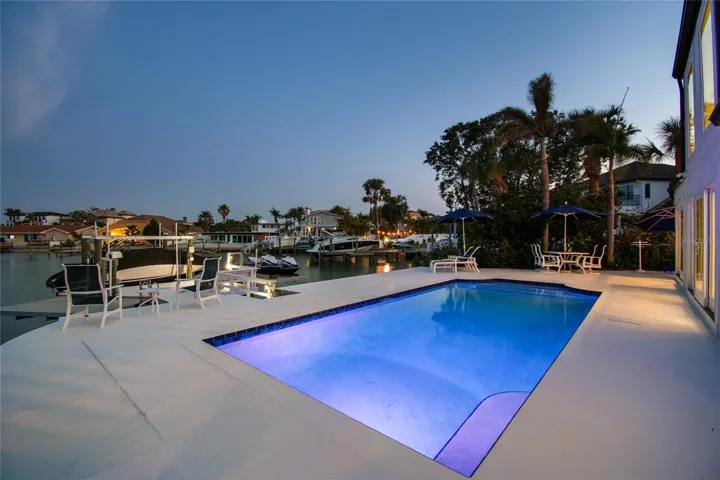 Step outside and indulge in your private paradise. A heated saltwater pool, standalone spa, expansive waterfront patio, and a fully equipped dock with a 10,000-lb boat lift, a jet ski lift (for 2 jet skis) and a kayak lift/launch, all with water and electricity. The home comes