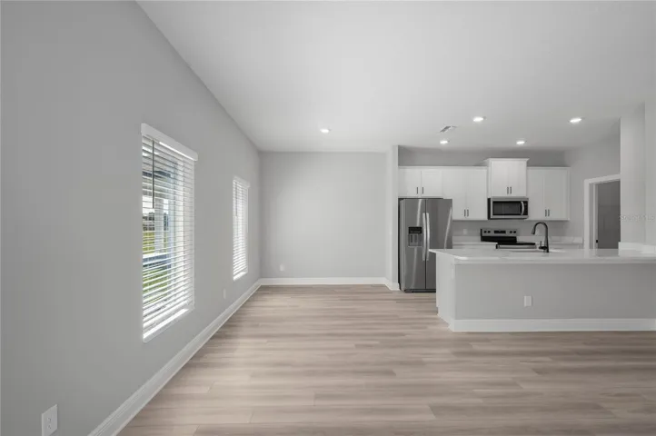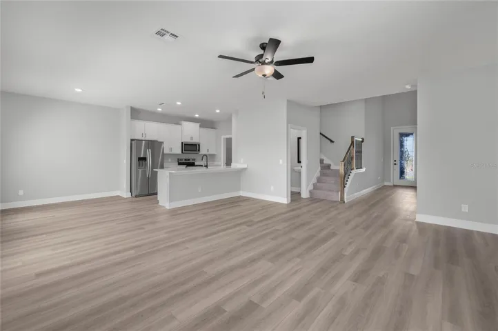 As you step into the home, a welcoming foyer leads you into the spacious family room, which flows seamlessly into a dedicated dining room and a chef-ready kitchen complete with quartz countertops, stainless steel Whirlpool appliances, a subway tile backsplash, sleek white cabinetry with matte black hardware, and a breakfast bar perfect for casual meals. The kitchen also features a huge closet pantry, offering ample storage for all your needs.