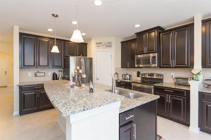 Stunning & Move-In Ready Home in the Desirable Ayersworth Community! Step into luxury and comfort with this impeccable 5-bedroom, 3-bathroom home, offering versatile living space including an office or 5th bedroom plus a spacious 2-car garage. With elegant details and thoughtful upgrades, this home is designed for both functionality and sophistication. Upon entering, you’ll be greeted by beautiful 18” tile flooring throughout the first floor, leading to an inviting formal family and dining room, perfect for entertaining. The open-concept design allows for an abundance of natural light, creating a bright and airy atmosphere. The chef’s kitchen is a true MUST-SEE, featuring granite countertops, espresso cabinets with stylish glass inlays, a spacious walk-in pantry, stainless steel appliances, a tiled backsplash, a breakfast bar, and a cozy nook, all seamlessly flowing into the great room. A convenient first-floor guest bedroom with a private glass sliding door entrance to the patio and an adjacent bathroom provides a private retreat for visitors. Upstairs, the owner’s suite is a luxurious escape, boasting tray ceilings, dual closets, a spa-like bath with dual sinks, a soaking tub, and a glass-frame shower. A large loft area offers additional flexible living space. Outdoor relaxation is at its finest with a wrap-around patio, including an extended, screened, covered lanai perfect for morning coffee or evening gatherings. The partially fenced backyard ensures privacy while allowing space for outdoor activities. Located just one block from the resort-style pool and clubhouse, this home is nestled in the sought-after Ayersworth Community, featuring a playground, basketball court, and fitness amenities. Conveniently positioned near St. Joseph’s Hospital, dining, shopping, entertainment, and major highways, this home offers easy access to Tampa, St. Pete, the Selmon Crosstown Expressway, and I-75.