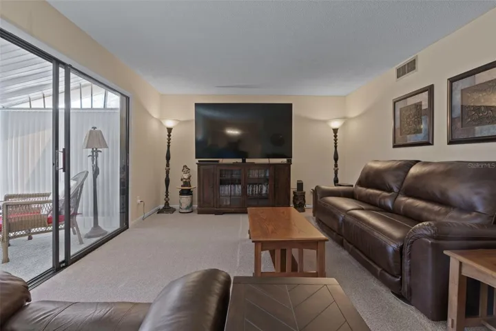 Wake up to stunning views of Jade Lake, the 11th Green of the golf course, and the nearby wildlife management area from this beautiful 2-bedroom, 2-bathroom Twin Lakes Village East condo. Enjoy the outdoors year-round from the enclosed, glassed-in, screened lanai, upgraded with new carpet and blinds. Inside, the well designed layout with newer carpet throughout, includes a full kitchen with a pass-through to the dining room. The kitchen was recently improved with new granite countertops, new installed SS wifi microwave, new SS refrigerator, new SS stove, new SS dishwasher, new flooring, track lighting, GFCI outlets, sink faucet, and cabinet hardware. A newer washer and dryer are also included, and all outlets and switches throughout the unit have been replaced. Both bedrooms are generously sized, with the primary suite offering a walk-in closet and an en-suite bathroom featuring a newer walk-in shower. Both bathrooms have been modernized with updated mirrors, faucets, light fixtures, water-saving toilets, and cabinet hardware. The home is equipped with a new 2.5-ton Rheem AC and air handler, as well as a Nest WiFi/Remote Access Thermostat system for smart, energy-efficient climate control. Storage is abundant, with a dedicated dining room closet, entry foyer closet, and 3’x6’ fully updated storage room on the lanai. Convenient parking is available with assigned spaces directly in front of the building. This 55+ community features a pool just a short walk away. For just $5/year, residents have access to Silver Springs Community Center, offering a Calendar full of Activities, including Fitness Center, Billiard Room, and much more inside and three swimming pools, hot tub, basketball, pickleball, tennis courts, Volleyball, and Lake access. Jon Boats and Kayaks for rent $10 a day for members. Nearby Wildlife management. Minutes to Shopping, Dining. Silver Springs State Park and Lake Weir a short drive away.