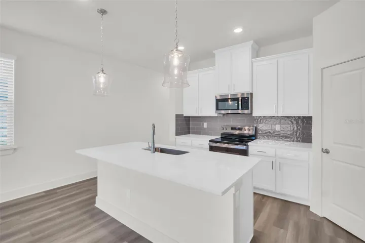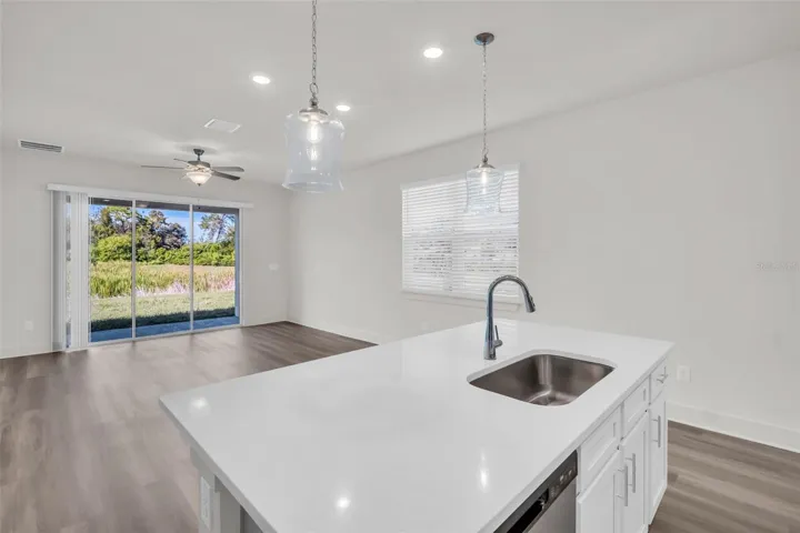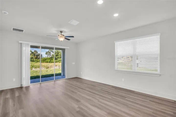 Step inside to find Luxury Vinyl Plank (LVP) flooring throughout and a bright, open-concept floor plan. The gourmet eat-in kitchen boasts 42” soft-close cabinets, Whitehaven quartz countertops, stainless steel appliances, a grey tiled backsplash, a large island, and a walk-in pantry. The window-filled family room features an 8′ tall triple slider door that opens to the lanai, enhancing indoor-outdoor flow.