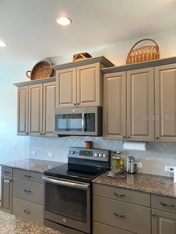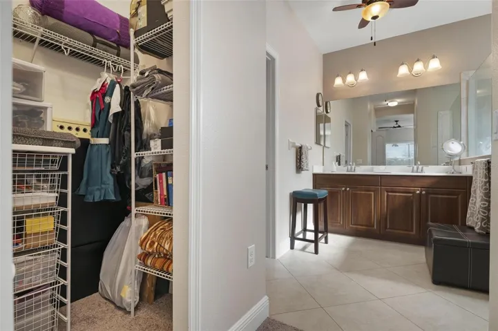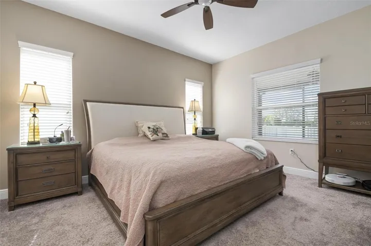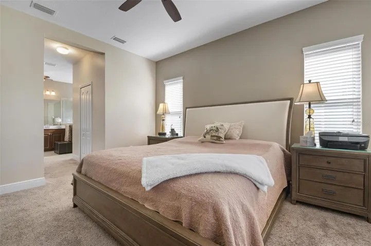 Inside, the layout feels clean and neutral with granite counters, crown-accented cabinetry, stainless appliances, a large walk-in pantry, pull-out drawers, Moen faucet, and both a breakfast bar and eat-in dining area. The living room features a tray ceiling with a floor outlet, and the primary suite sits quietly at the back of the home with two walk-in closets, soft-close drawers, and a spacious shower. The grout throughout the home has been professionally cleaned and the baths resealed, so it’s truly move-in ready.
