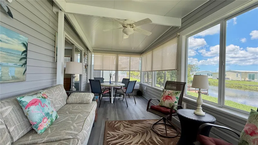 Step into a sun-filled open-concept layout that blends comfort and functionality. The kitchen is equipped with attractive countertops, a center island with slide-out drawers for extra prep space, and a cozy dining nook—perfect for morning coffee or evening meals. The spacious living room flows seamlessly into the remodeled Florida room (an additional 220 sq ft of living space), boasting expansive windows that capture tranquil views of the water.