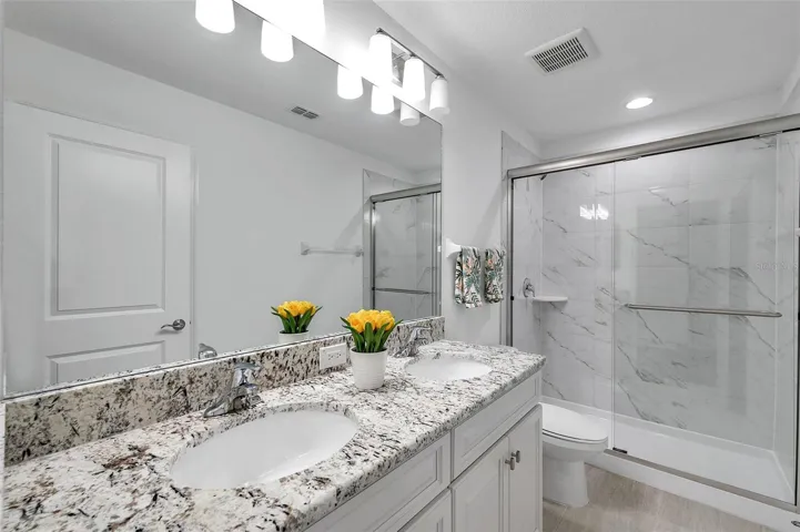 Upstairs, the expansive loft provides the perfect space for a bonus room, media room, or game room. Each of the generously-sized bedrooms offers ample closet space, including the second Owner’s Suite, which features a large walk-in closet and elegant granite dual vanities in the en-suite bath.