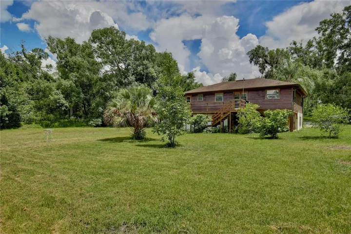 SIGNIFICANT PRICE IMPROVEMENT! Investment Opportunity – Live on one floor and Rent the other! Welcome to your personal retreat nestled on a serene 1 acre paradise. This four bedroom, three bathroom house situated at the end of a private drive is surrounded by lush palm trees and a sprawling landscape, creating an oasis for relaxation and entertainment. As you step onto the property, you’ll be greeted by the beautiful screened balcony’s patio. The French door entry welcomes you into a spacious great room that radiates warmth with its vaulted ceilings, natural light, and wood flooring. Mealtime is a breeze in the kitchen boasting generous cabinet storage, a sleek stainless steel fridge, bar top seating, and peaceful views of the tranquil backyard. Adjacent to the kitchen, the dining space provides seamless access to another balcony with its own set of French doors, perfect for al fresco dining or simply enjoying the picturesque surroundings. Retire to the comfort of the primary bedroom, a sanctuary featuring a walk in closet, balcony patio access, and an en suite bath complete with an LED mirror, expansive counter space, and a spa-like glass door shower adorned with decorative tile. Two additional light and airy guest bedrooms and a well appointed guest bathroom round out the second floor. The first floor presents versatile living options with a separate private entrance that could serve as a mother-in-law suite or rental unit, adding potential monthly cash flow. This space includes a dining and living area, a kitchenette, a full bathroom, and a bedroom. Located just minutes from Stetson University, the charming downtown area of DeLand, Walmart, shopping and dining options, DeLand Municipal Airport, and the natural beauty of Blue Springs State Park. Stroll the downtown streets and grab a drink, swim with the manatees at the springs, or go skydiving at the airport. This serene and private location is close to both the beauty of nature and the convenience of the city. Don’t miss the opportunity to claim this gem as your own—schedule a showing today! **Sellers are working on having the driveway redone and the brush cut back** Home under video survelliance