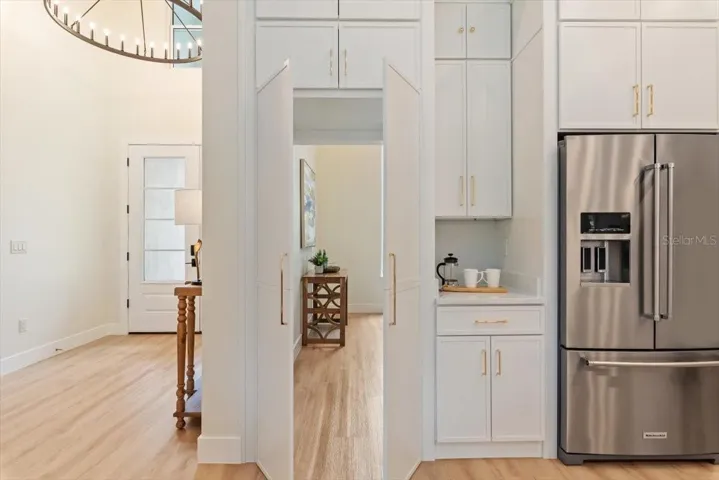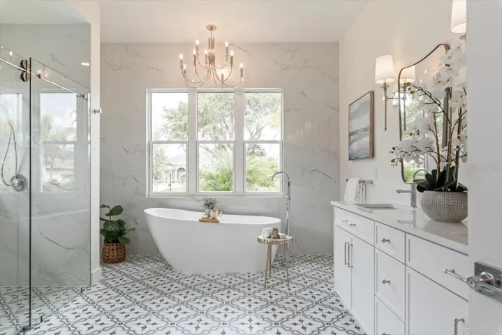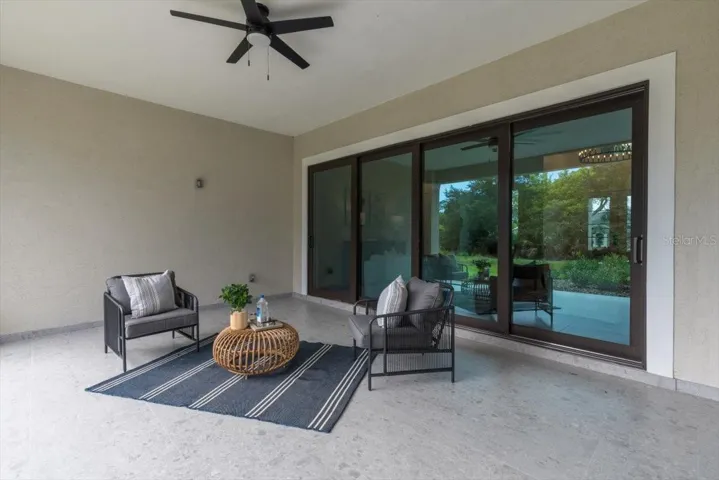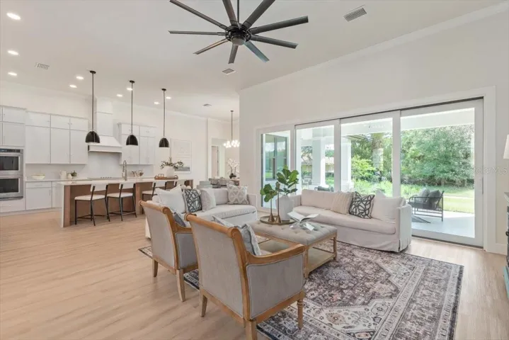 NEW 2025 CONCRETE BLOCK HOME, thoughtfully crafted for everyday living and effortless entertaining, with luxury touches. From the moment you arrive, the home impresses with its striking architectural features, smooth-finish walls & ceilings, and a neutral color palette that enhances the sense of elegance throughout. Soaring 12-16 ft ceilings provide an airy ambiance, while wide luxury vinyl plank flooring adds warmth and durability underfoot. Enjoy expansive windows and multi-panel sliding glass doors, bringing the outside in and highlighting the home’s open inviting layout. At the heart of the home is a chef’s dream gourmet kitchen that is sleek, modern, and incredibly functional. Quartz countertops stretch across an oversized waterfall island and continue as a full-height backsplash, perfectly complementing the ceiling-height premium cabinetry. Tucked nearby is a private butler’s pantry offering additional workspace, storage, and elegance rarely found. Adjacent to the main living areas is a private study with French doors providing the perfect retreat for working from home or quiet reflection. The spacious laundry room, complete with built-in cabinetry and quartz counters, brings both style and convenience to daily routines. The luxurious primary suite offers a peaceful escape, featuring a spa-inspired bathroom with a frameless glass super shower, dual shower heads, a deep soaking tub, double vanities with quartz counters, and a private water closet. Three additional bedrooms are generously sized with ample closet space and are thoughtfully positioned providing privacy and comfort for family or guests. Two well-appointed full bathrooms with upgraded finishes serve the secondary bedrooms, while another convenient half bath is ideally located for guests. Outdoor living has been thoughtfully designed with a sprawling double lanai with an outdoor kitchen, ideal for year-round entertaining. There is endless potential with room for a future pool to create a private resort-style retreat. This home is the perfect blend of modern luxury, thoughtful details and timeless comfort.