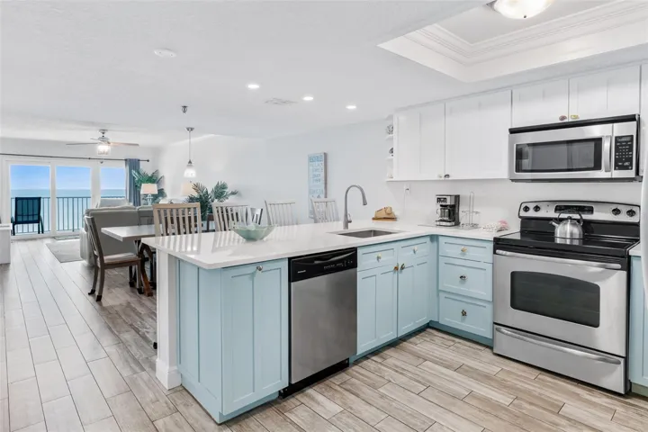 The spacious living area is tastefully decorated with a beachy vibe and new living room furniture. Beautifully updated kitchen with lots of cabinetry and new quartz counters. Updated bathrooms, Master bathroom has roll-in shower. Large bedrooms with walk-in closets and utility room with full size side by side washer/dryer in unit all add to its appeal. New hurricane rated sliding glass doors and windows in 2019. HVAC and washer/dryer replaced in 2019.