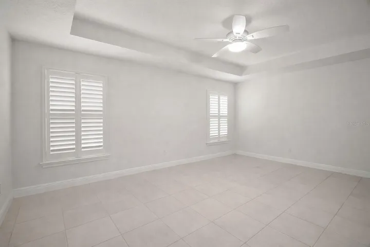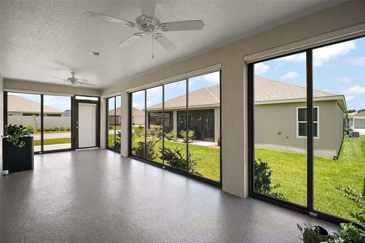 The primary suite is a private retreat with a tray ceiling, dual walk-in closets, and an elegant en-suite bath that offers dual quartz vanities, a Roman-style tiled walk-in shower, and a private commode room. Two guest bedrooms are located on the opposite side of the home, each with built-in closets and easy access to a full guest bathroom with quality finishes. One of the standout features is the fully enclosed 12-foot by 29-foot lanai, finished with epoxy flooring and a dedicated mini-split HVAC unit, offering year-round versatility for relaxing, entertaining, or hobbies. Additional upgrades include a two-car garage plus a separate golf cart garage, whole-house gutters, an owned Pegasus water system, an Eaton surge protector, and concrete flooring in all garage spaces.
