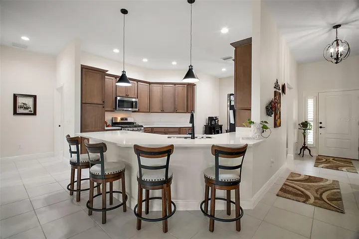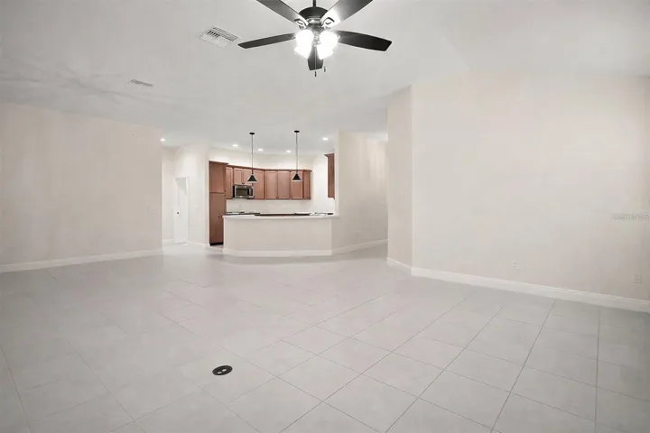 One or more photo(s) has been virtually staged. One or more photos) has been virtually staged. Welcome to this beautifully upgraded Mockingbird Designer model located just 35 minutes from Orlando in the Village of Lake Denham. Built in 2023 on a landscaped corner lot, this 3-bedroom, 2-bath home offers 1,954 square feet of thoughtfully designed living space with tile flooring throughout, high knockdown ceilings, and an open split floor plan that balances everyday comfort with effortless entertaining. The kitchen features quartz countertops, generous cabinetry, a breakfast bar, and a bright eat-in dining area. The spacious living room includes plantation shutters, a ceiling fan, 5-inch baseboards, and architectural accents that continue throughout the home.