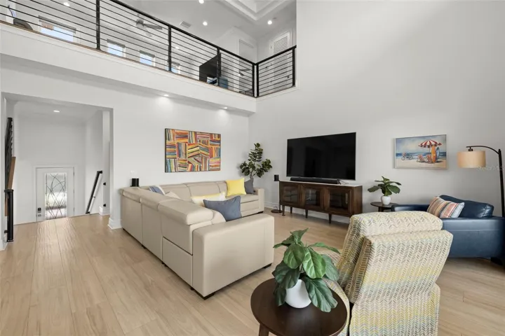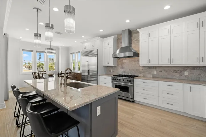 Built in 2021, this modern Mediterranean villa style home with partial views of the intercoastal is located in the beautiful community of Belleair Beach. This home not only has the advantages of being a newer home built with spectacular architectural detail and is also elevated above the flood plain. A short walk to the beach, the house is located on a quiet side street on an oversized lot complete with new vinyl fencing that offers privacy. It also provides enough room to let your pets roam around! A large, gas heated pool and spa with a built-in sundeck were added in 2022. This outstanding home with camera system and electronic keypad has everything you could expect in a dwelling of this caliber. The stairs or the elevator take you to an open split floor plan which features 4 bedrooms, 3.5 baths all designer inspired, an open spacious downstairs family room with a 2-story soaring coffered ceiling for a dramatic spacious effect, a loft area on the third floor serves the upstairs 3 bedrooms as extra living space for family and guests. The fresco balcony space with its designer railing add to the impact of the overall contemporary design. The modern kitchen is spacious and flows off the downstairs living area for entertaining, the large center island with extra sitting, ample quartz countertops, Viking stainless steel appliances, generous custom coastal style cabinetry, built in oven and microwave, gas stove with custom range hood all make this kitchen a chef’s delight and a center pointe for get togethers. There are two ensuite bedrooms, the one on the second level is the primary with custom walk-in shower and garden tub. Other features of this home include custom window treatments, an oversized garage with epoxy finish flooring and enough space for all the toys and even an extra workshop space. In 2025, an AC system was added to the garage area and also a generator to serve the entire house in case of temporary loss of electricity. There are two zone high efficiency heat pump air conditioners, Pella impact windows and doors throughout, professional landscaping with fruit trees and auto sprinkler system. Located minutes from shopping, restaurants and famous Clearwater Beach, this is a complete package on a hardly lived in newer home that you don’t want to miss. Upfront disclosure: the property had minimum water intrusion in the garage area during the devastating 2024 Hurricane Helene. Both cars in the garage at the time were not affected and there was no need for a flood claim.