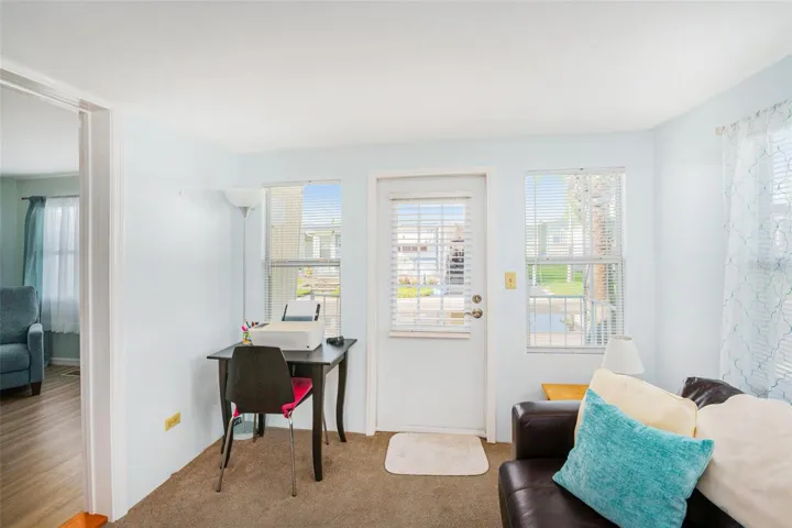 Welcome to this bright, coastal-inspired retreat featuring two bedrooms and one-and-a-half baths. The moment you step inside, you’re greeted by a versatile flex room—currently styled as an office and sitting area—carpeted for comfort. Just beyond, the open living, dining and kitchen space flows on luxury vinyl plank flooring, with a crisp white kitchen showcasing ample cabinetry, sleek countertops and a mosaic tile backsplash. A peninsula-style island provides two barstool spots and maximized cabinet storage, perfect for casual meals or entertaining friends. Climate control is effortless thanks to the central air system, augmented by a centrally located mini-split unit that keeps the home cool in the most energy-efficient way. The first bedroom, located just off the main living area, is carpeted and ideal for guests or hobbies. Down the hall, you’ll find the full bathroom and the separate primary suite with its own half-bath ensuite. The primary bedroom boasts three generous closets, offering storage in abundance. Outside, a covered carport accommodates both a full-size vehicle and a golf cart, while additional exterior storage and a dedicated laundry area ensure all your practical needs are met. Throughout, the home’s soft hues and beachy accents create an inviting, sunlit atmosphere that feels like vacation every day.