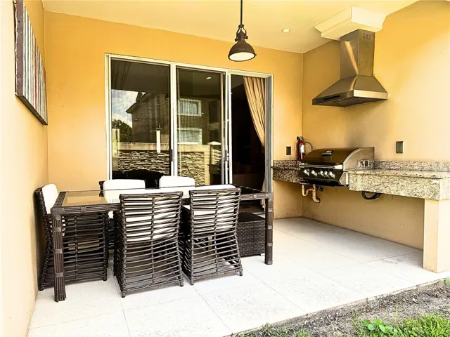 The main living space opens to an outdoor summer kitchen area with sink and grill, perfect for entertaining. The second-floor master suite features a private balcony, adding an elegant touch and additional space to relax.