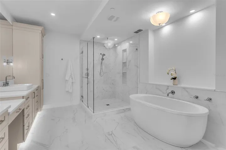The owner’s suite is a true sanctuary, boasting a tranquil waterfront sitting area, dual custom closets, and a spa-inspired en suite with double vanities, makeup station, free-standing soaking tub, and a luxurious multi-head rain shower enclosed in glass with elegant tilework.