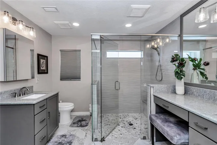 The spacious primary suite is a private retreat with a newly remodeled spa-style bathroom featuring a large tiled shower with built-in bench and high-end finishes. Guest bedrooms offer new luxury carpeting, with one perfectly suited as a home office or flex space with custom built-ins. Recent improvements include a brand-new 2025 roof and 2025 A/C, new washer and dryer, whole-home water softener, reverse osmosis system, plantation shutters, surround sound, epoxy-coated garage floors, rain gutters, thermal panels, and a dedicated golf cart garage for easy course access.