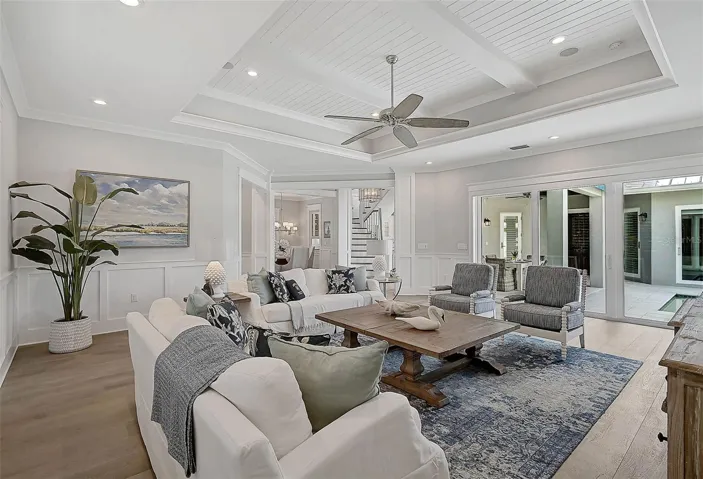 Perfectly positioned mid-key and just 500 feet from the shell-filled shoreline, this beautiful home with a fenced-in yard spans two levels and features a separate guest house. Enter the property through the interior courtyard, past the covered al fresco dining area, to the soothing sound of a waterfall flowing from the pergola into the heated pool. Sunlight from the central courtyard brightens all interior living spaces by day, while the pool-area lighting creates a relaxing ambiance at night. This four-bedroom home with three full and two half baths offers 3,300+ square feet and is a Brista Homes architectural gem, built to exceed code requirements with high-impact windows and doors on a protective, elevated site. The first-floor owners’ retreat includes an expansive en-suite with a doorless shower, dual vanities, and a soaking tub. Every need has been met and every detail considered, with rich finishes and amenities throughout, including home automation and lighting control, a security system, motorized awnings and window shades, plantation shutters, wainscoting, shiplap tray ceilings, crown molding, 12-inch baseboards, and wide-plank oak floors. The chef’s kitchen features Sub-Zero refrigeration and Thermador appliances, along with a butler’s pantry. The kitchen, dining room, living room, owners’ suite, and a private office with a wet bar all enjoy views of the tropical landscaping and the courtyard. Guests will appreciate the choice of the private casita or two upstairs bedrooms that open to a large terrace offering sunset views over the Gulf. With no HOA fees, a prime location, and a short walk to the town center, this coastal property offers the finest in comfort, privacy, and convenience. Professionally decorated and meticulously maintained with furnishings also available under a separate addendum.