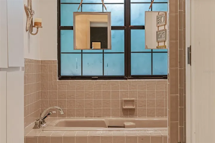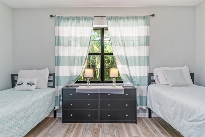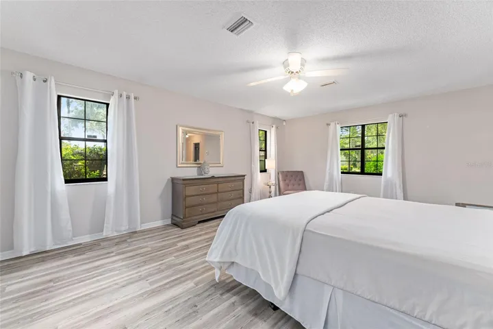 This home’s split bedroom plan ensures privacy and comfort for all. The two guest rooms are generously proportioned and share a lovely bathroom with a dual sink vanity and subway tile combination tub shower. Tucked away on the opposite end of the home, the primary bedroom exudes tranquility. Drenched in natural light, it features a spacious walk-in closet, sliding glass doors leading to the screened-in porch, and an en-suite bathroom. Indulge in relaxation in the en-suite’s double vanities, step-down soaking tub, and walk-in shower.