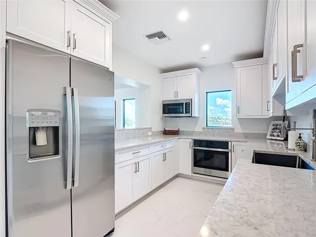 Now offering this designer updated condo in the heart of Naples! Enjoy your breakfast, dinner and cocktails overlooking the large bay with unobstructed views. Across the street from the beach for your walks on the white sandy beachline. The kitchen is tastefully done with quartz counters, stainless appliance package, upgraded cabinets, under island storage cabinets and more! The bathrooms offer completely tiled showers, seamless glass doors, quartz counters, and other high-quality finishes. Also, each bathroom has a very unique built in medicine storage area! Tile in the entire unit is top end 24-inch marble, and the lanai is enclosed to add to the total under air living space. You are assigned parking space #14 under cover and there are tons of open parking outdoors for your use and your visiting guests. Offered Furnished with all furniture in the unit included! Make your appointment now to see how nice this condo is!!! The Madrid Club is an extremely well-maintained building offering a large outdoor area with lovely pool overlooking the bay, kayak storage, and a pavillion for your use with grilling available.