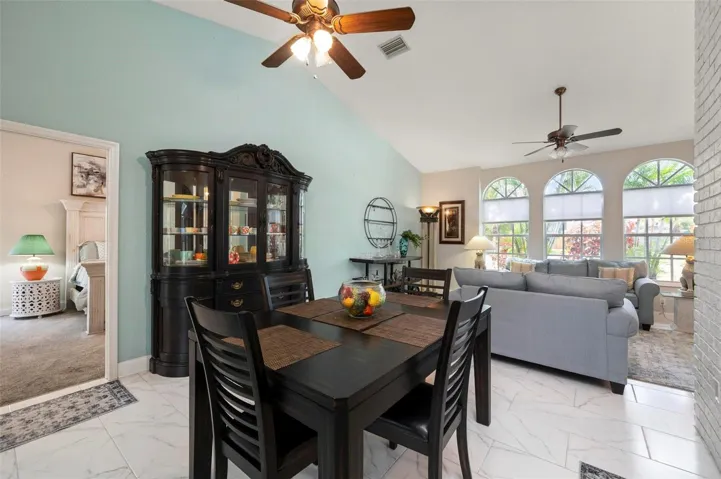 Step through the double front doors into soaring ceilings and an open, bright floor plan. The large great room features a stunning wood-burning fireplace as its centerpiece and flows seamlessly into the family room, providing plenty of space for relaxation, entertainment, and family gatherings. All new marble-like ceramic tile extends throughout the main living areas, enhancing the home’s clean and contemporary feel.
