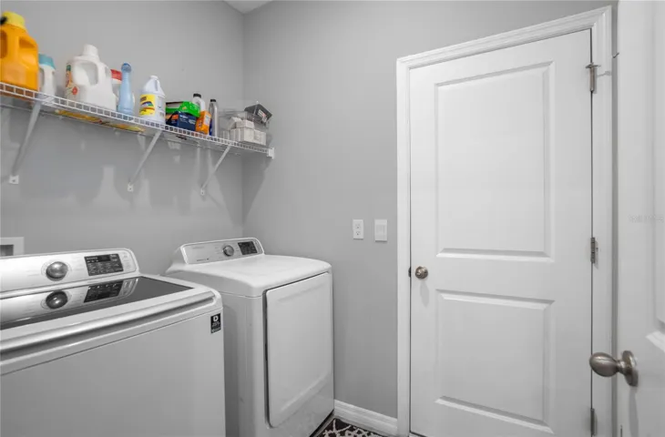 The heart of the home is the chef-inspired kitchen, showcasing granite countertops, a large center island with sink, stainless steel appliances, and crisp white cabinetry. Designed for both entertaining and everyday living, the kitchen opens directly to the oversized great room and dining space, with sliding glass doors leading to the screened lanai—perfect for enjoying Florida’s indoor-outdoor lifestyle.