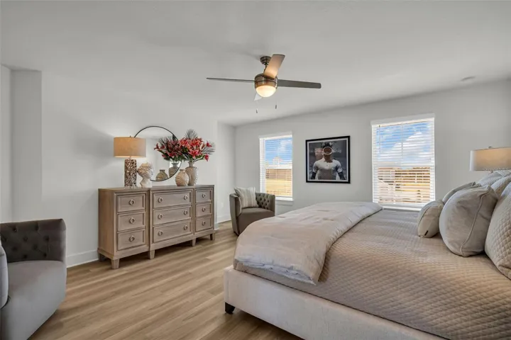 Upstairs offers two oversized bedrooms with walk-in closets, a full laundry room, and a versatile loft—perfect for a home office or game room. The owner’s suite includes a sitting area, huge walk-in closet, dual quartz vanity, and a tiled shower with glass door.