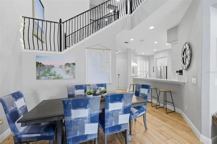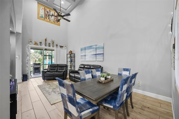 Step inside to an open floor plan with soaring ceilings, abundant natural light, and modern “wood-look” porcelain tile floors. The renovated kitchen features custom cabinetry, quartz countertops, subway tile backsplash, updated appliances, and a stylish butcher block breakfast bar. The dining and living areas flow seamlessly to the screened lanai—perfect for entertaining or enjoying a quiet morning coffee.