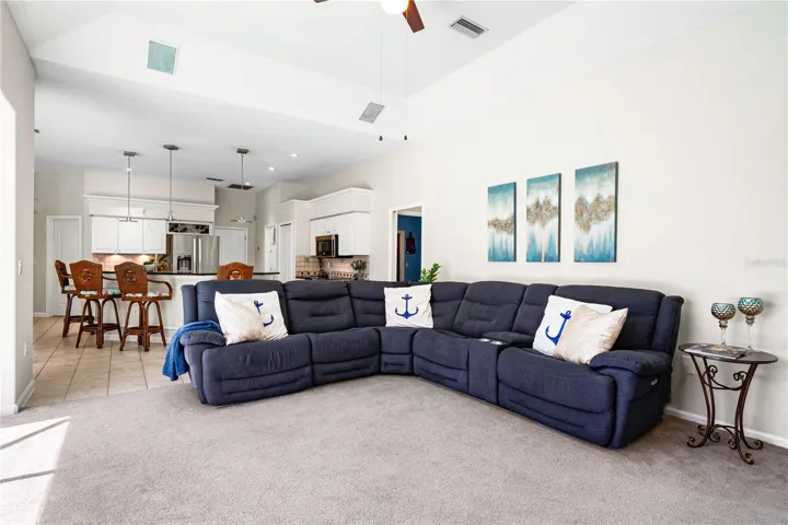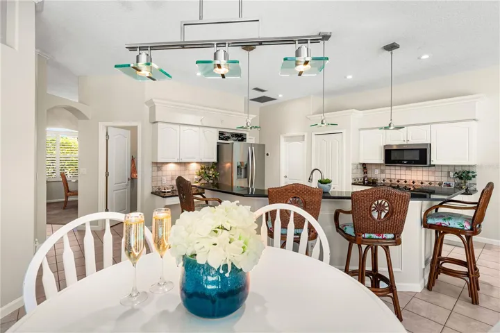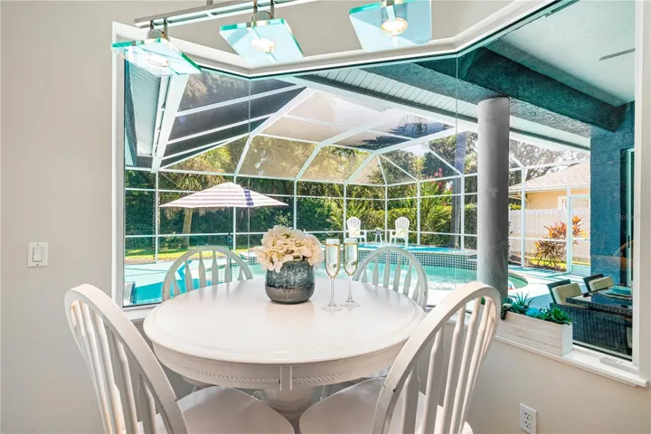 Inside, high ceilings and an abundance of natural light set a welcoming tone. The formal living and dining rooms flow to the heart of the home – a well-appointed kitchen designed for everyday living and entertaining, featuring granite counters, tile backsplash, stainless appliances, a center island with raised breakfast bar, closet pantry, built-in desk and wine rack, recessed & pendant lighting, and a picturesque breakfast nook with wraparound windows. The kitchen opens to the spacious family room with a tray ceiling and mirrored media niche. A pocketing three-panel slider seamlessly extends the living space to the covered lanai and screened pool; additional sliders from the formal living room, the primary suite, and a secondary bedroom maintain the indoor–outdoor connection.