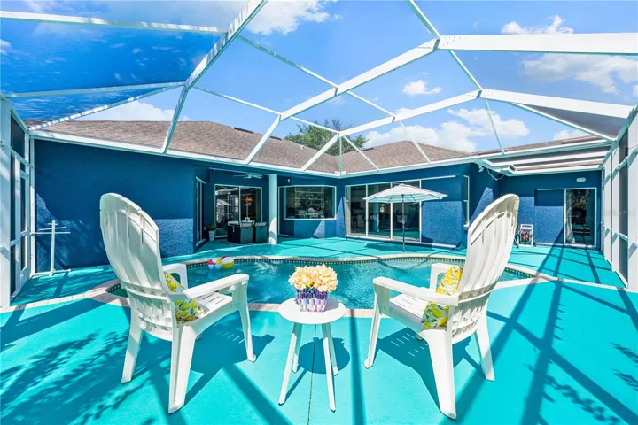 The private primary retreat offers lanai access, two closets (one walk-in), and a spa-like en-suite bath with a Jacuzzi jetted soaking tub framed by an arched window with plantation shutters, separate walk-in shower with wall body sprays, a long double vanity, and a private water closet. Thoughtful split-bedroom design places three secondary bedrooms and a full bath together in their own wing (one is oversized with lanai access that can flex as a game/media space), while a full 5th bedroom – currently used as an office – sits near the primary suite. An interior laundry room adds storage shelves, cabinets, and a utility sink. Major updates for peace of mind include: replumbed water lines, roof (2015), A/C (2019), new water heater (2024), new pool pump (2024), kitchen appliances (2021), washer and dryer (2023), polycarbonate storm panels, and irrigation.