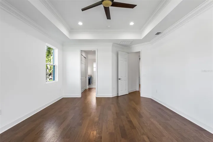 The owner’s suite is a private haven with multiple closets and a spa-inspired bath featuring quartz vanities, a soaking tub, and a walk-in dual shower. This home also features Engineered hardwood floors, custom lighting fixtures, ceiling fans, crown molding, tray ceiling in master suite, circular driveway with pavers, and an oversized two car garage.