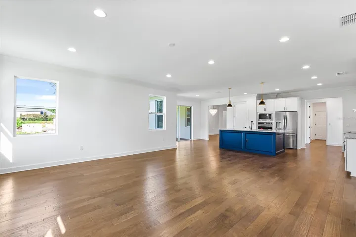 The open-concept layout centers around a gourmet kitchen with a large island, breakfast nook, quartz countertops, Frigidaire Gallery appliances, a large walk-in pantry, and a spacious great room, plus additional living and dining areas perfect for entertaining. Sliding doors extend the living space onto an oversized covered lanai, creating the ultimate indoor/outdoor retreat.