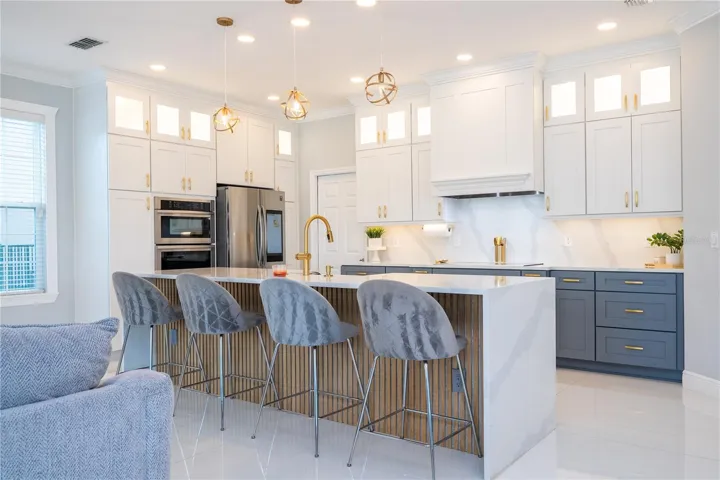 The gourmet kitchen boasts custom white cabinetry, quartz countertops with a waterfall island, and high-end appliances. The owner’s suite offers a spa-like bath with soaking tub, double walk-in shower, and custom walk-in closet. Additional highlights include a family room with custom fireplace wall, remodeled laundry, and luxury details throughout.