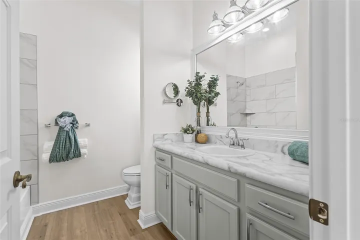 BOTH spacious bedrooms are EN-SUITE BATHROOMS with generous walk-in closets, offering privacy and comfort for family and guests. The owner’s suite boasts an panoramic view of the golf course and a customized walk-in closet designed for optimal storage. In addition to the two full bathrooms, a convenient HALF BATH adds flexibility for visitors.