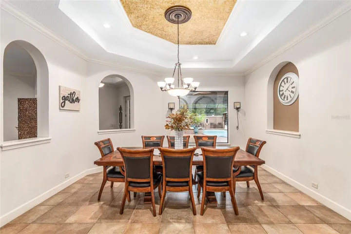 Privacy. Exclusivity. Stunning Custom built Mediterranean Oasis! Magnificent masterpiece prominently displayed in the exclusive gated Devonshire development of Ocala. Through the massive inviting double wood doors, you are greeted by an oasis of splendor splashed with serene prominence and gentle relaxation. Be graced by a simple lifestyle when you call this residence home. The multi-use entertainment suite (5th BR) with a kitchen, bar and full bath can also serve as an in-law suite, teenager’s haven or movie room (with a projector, electric screen and blackout curtains), with a door to your amazing summer kitchen with a grill, counter bar with stools and outside kitchen set-up. The focal point is the wraparound veranda surrounding your salt fiberglass pool, heated spa and outside shower. Through the French doors, the primary home is complemented by arched doorways, wood and tile floors, large spacious rooms, a gas fireplace in the great room, and the oversized kitchen with an island, upgraded GE Profile appliances and a pantry with built-in shelving. Two bonus rooms provide options for multi-use, a growing family, or multi-generational living. The split-plan smartly offers privacy for family and guests. The enormous primary suite offers a dreamy and glamorous bath with dual vanity sinks, a step-in shower, a jetted tub, a spacious walk-in closet with custom built-ins and a door to the veranda. Situated on an oversized corner lot in a cul-de-sac, the circular drive, outside fire pit, pergola and plentiful yard space complete the residence. Custom designed and built exclusively for this owner, this home offers many upgrades, including smart home features throughout, surround sound throughout inside and outside plus equipment, high ceilings, arched doorways and windows, quality wood, quality tile, quartz and granite counters, driveway pavers, plus all televisions and furnishings stay. Feel the quality throughout this Mediterranean oasis – a must-see to appreciate. Simply Elegantly Stunning.