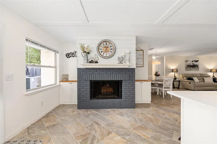 Inside, porcelain tile flooring spans the entire home, leading into a show-stopping, fully remodeled modern farmhouse kitchen. Thoughtfully designed to impress, it features a deep farmhouse sink, custom cabinetry, quartz countertops, a spacious center island perfect for casual dining or entertaining, and a cozy breakfast nook. The open living area is warm and inviting, enhanced by a built-in corner fireplace that adds both character and ambiance. The spacious primary suite offers a true retreat, complete with walk-in closets featuring custom built-ins, a sleek modern vanity, and a stunning tiled walk-in shower. Enjoy seamless indoor-outdoor living from the open-concept back patio—ideal for relaxing, entertaining, or simply enjoying Florida’s year-round sunshine. Residents of On Top of the World enjoy 24/7 security and resort-style amenities including multiple pools, clubhouses, fitness and recreation centers, and golf-cart access to two nearby shopping centers. Conveniently located just minutes from healthcare, grocery stores, and restaurants, and the World Equestrain Center, this fully furnished, move-in-ready villa offers a rare opportunity to step straight into the lifestyle you’ve been waiting for.