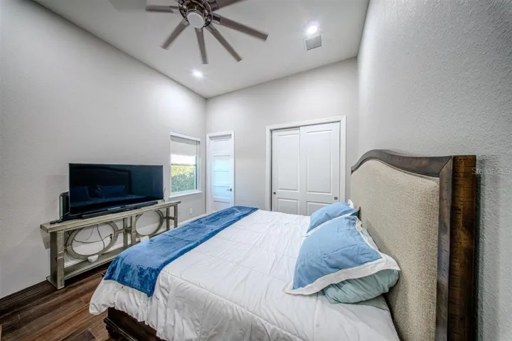 This two-story residence features five spacious bedrooms, including a grand primary suite with a generous walk-in closet. The additional bedrooms include built-in closets and are thoughtfully designed to provide comfort and functionality. With four full bathrooms and one half bathroom, the home ensures ample space and privacy for both residents and guests.