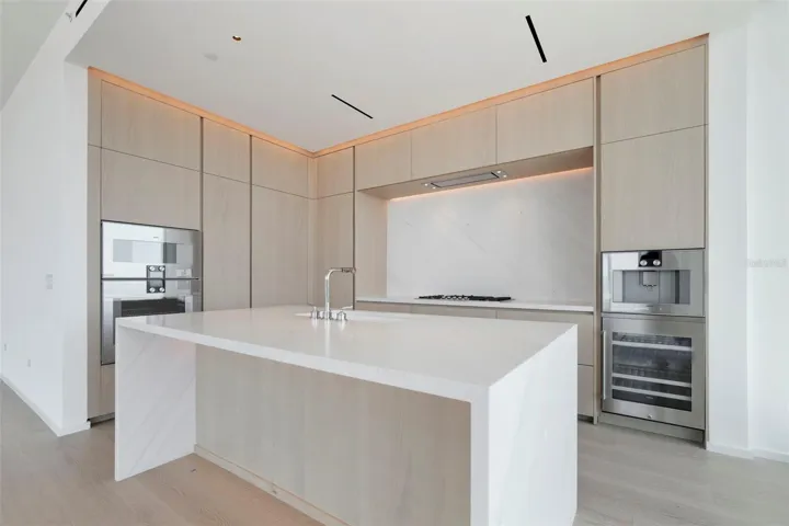 exceptionally inviting spaces with ten-foot ceilings. Wide plank 10-inch white oak Grato hardwood floors throughout. Polaris White marble kitchen countertops with waterfall island and custom white oak Molteni Italian