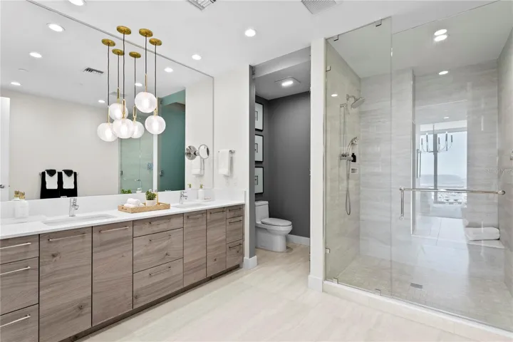 Fully Reimagined and designed in 2024, this new condo is a true masterpiece where every inch has been thoughtfully curated for the most discerning tastes. From the moment you step through the custom archway, the level of craftsmanship is evident, setting the tone for what’s to come. The OPEN-CONCEPT LIVING SPACES are an absolute showstopper, featuring exquisite, HAND-SELECTED DESIGNER TOUCHES that elevate the space to another level of elegance. The main attraction is the CUSTOM MEDIA WALL WITH HIDDEN GUEST ROOM DOOR. The tone in the living room is set with THREE SILK-WRAPPED CHANDELIERS that illuminate, while a FRAMED ART WALL with TEXTURED WALLPAPER creates a bold statement. The ELEGANT TRAY CEILING with RECESSED LIGHTING enhances the sense of grandeur throughout the home. At the heart of this residence is a CHEF’S KITCHEN that is as beautiful as it is functional. The approx. 5’x11′ EXPANDED ISLAND WITH A DOUBLE WATERFALL EDGE and concealed cabinetry, all WRAPPED IN SLEEK PORCELAIN, is a true work of art. The matching backsplash ties the entire space together in perfect harmony. The BUTLER’S PANTRY is a fusion of practicality and indulgence, complete with a WINE COOLER, QUARTZ COUNTERTOPS, CUSTOM CABINETRY, and laundry space, offering an unparalleled level of convenience. The DEN IS AN OASIS OF FUNCTIONALITY AND ELEGANCE, equipped with FULL-HEIGHT CUSTOM CABINETRY, an oversized chandelier that demands attention, and wallpapered accents for a refined, personalized touch. The OWNER’S SUITE OFFERS THE ULTIMATE RETREAT, combining peace and luxury with a WALLPAPERED ACCENT WALL, a DESIGNER CHANDELIER, and CUSTOM CLOSETS that are as stunning as they are spacious. The SPA-LIKE EN-SUITE BATH takes relaxation to the next level, boasting a CUSTOM LINEN CLOSET illuminated to highlight its beauty, along with three luxurious pendant lights. Every aspect of this home has been meticulously upgraded, from TILE FLOORING and LUTRON ELECTRIC BLINDS to thoughtfully curated designer finishes on walls, trim, and ceilings. As a resident of Saltaire, you’ll enjoy world-class amenities including a resort-style pool, a state-of-the-art fitness center, expansive club rooms surrounded by glass that bring the outdoors in, and a pet-friendly dog park with a washing station. The 7th-floor terrace offers breathtaking panoramic views of the bay and downtown skyline, while the vibrant city life is just steps away from your front door. This is truly an extraordinary opportunity to live in a LUXURY HOME WHERE UNPARALLELED DESIGN MEETS EXTRAORDINARY CONVENIENCE. With the added peace of mind of the builder’s warranty, this is a rare find in the heart of downtown.